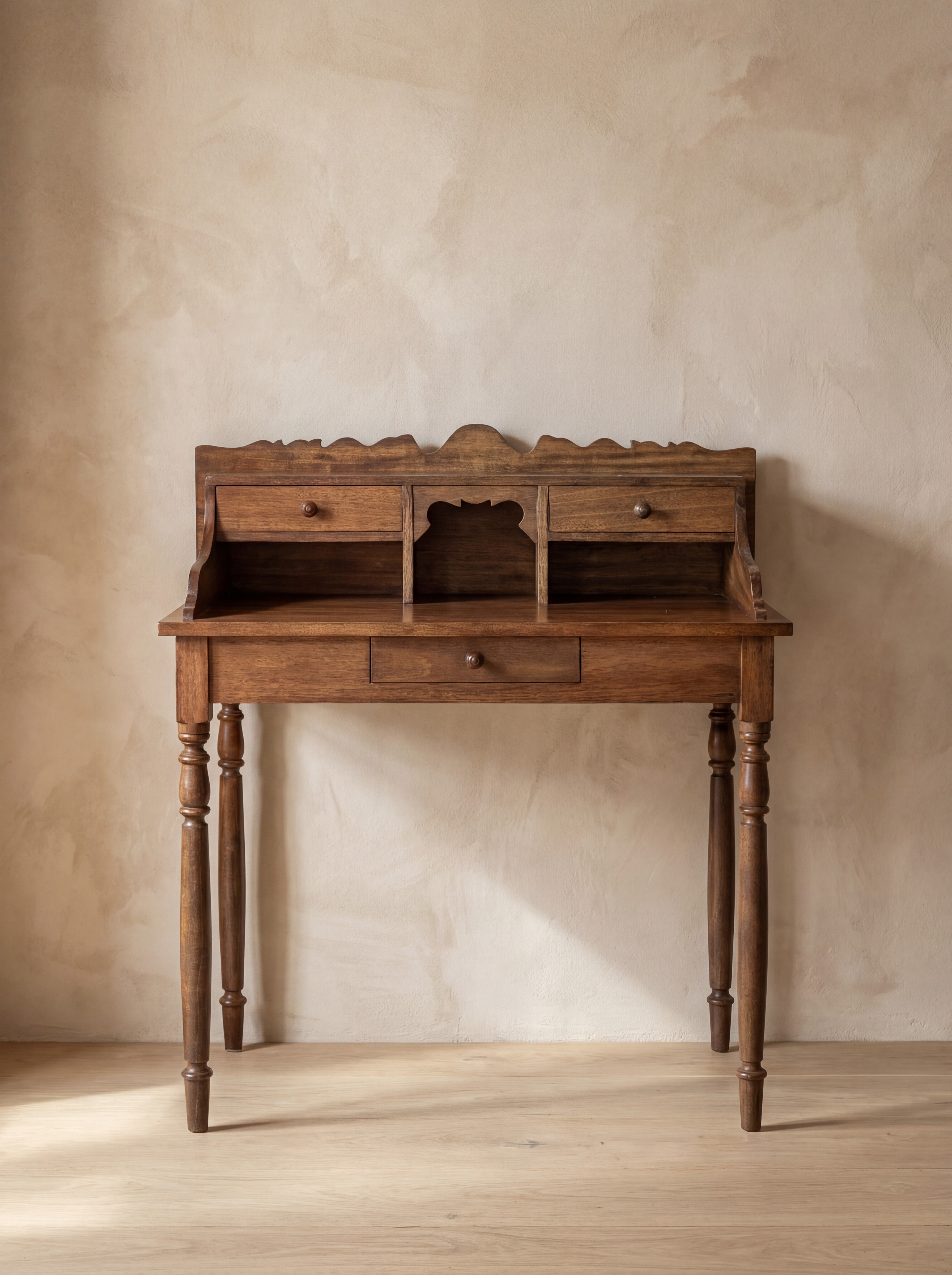 La composition du gradin supérieur et l’organisation des tiroirs évoquent certains secrétaires et petits bureaux présents dans le mobilier domestique européen ancien, où fonctionnalité et élégance se rejoignent dans des pièces destinées à l’écriture et au rangement. L’ensemble propose ainsi une interprétation contemporaine de ce type de meuble classique, où la chaleur du bois massif dialogue avec un vocabulaire formel inspiré des styles européens traditionnels.