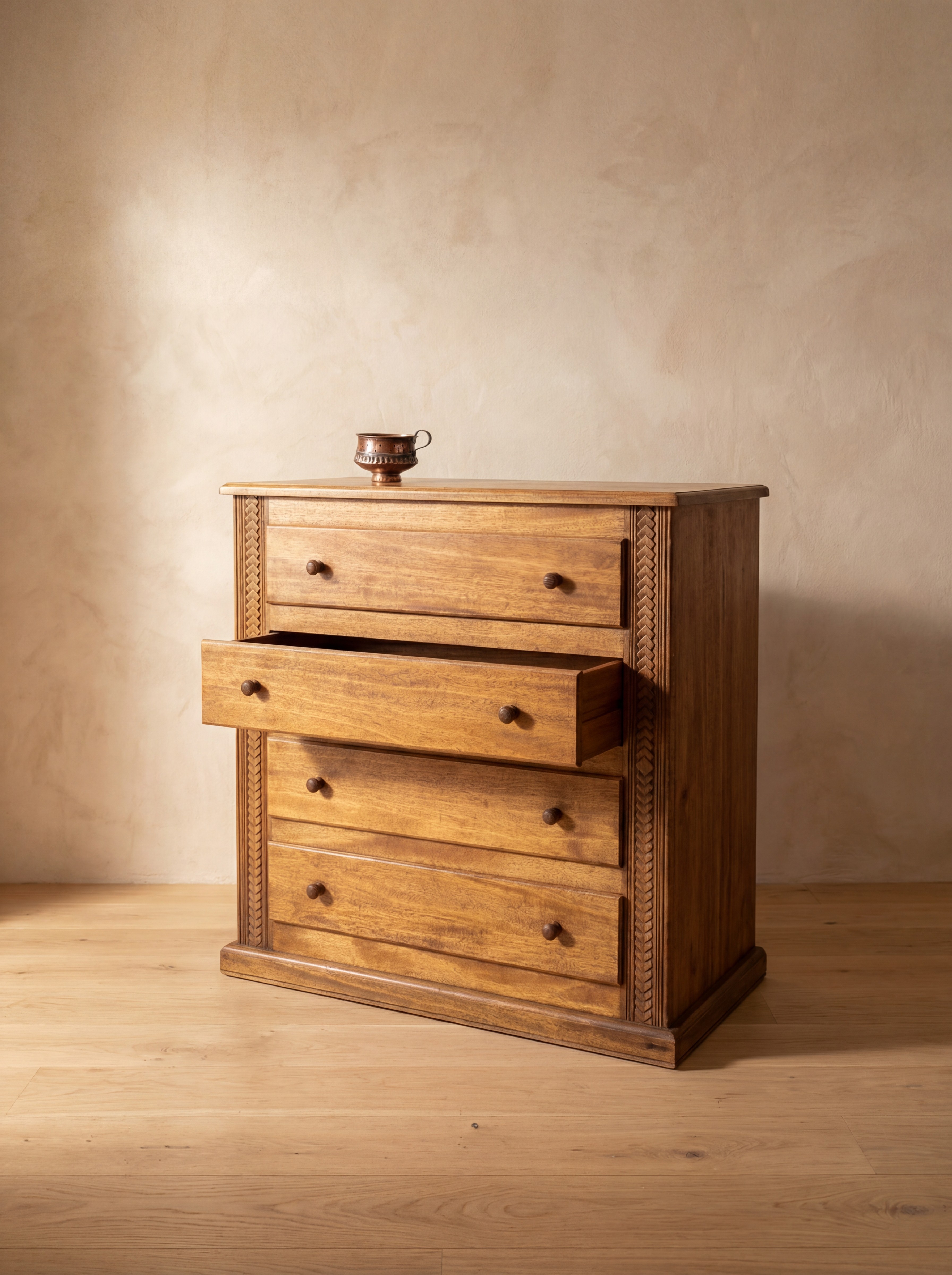 Cette commode sculptée motif losange appartient à la collection « Mémoire gravée dans le bois », qui met en valeur le travail de sculpture artisanale et les motifs géométriques inspirés du patrimoine décoratif.