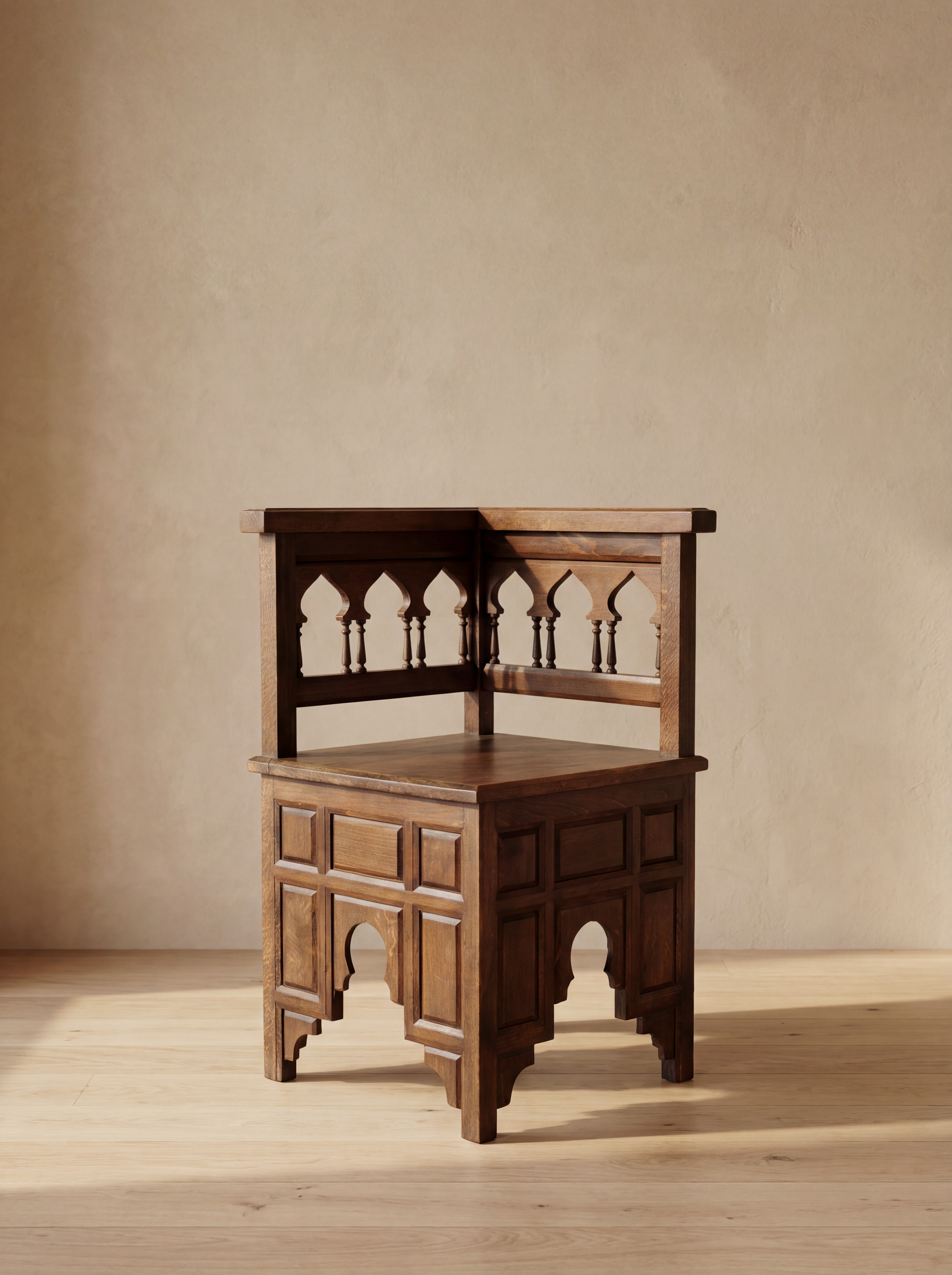 Les arcs découpés et les éléments tournés du dossier créent un jeu de reliefs et de transparence qui apporte légèreté visuelle à la structure. L’ensemble propose une interprétation contemporaine d’un siège d’angle traditionnel, mettant en valeur la richesse du travail artisanal et la profondeur du bois massif.