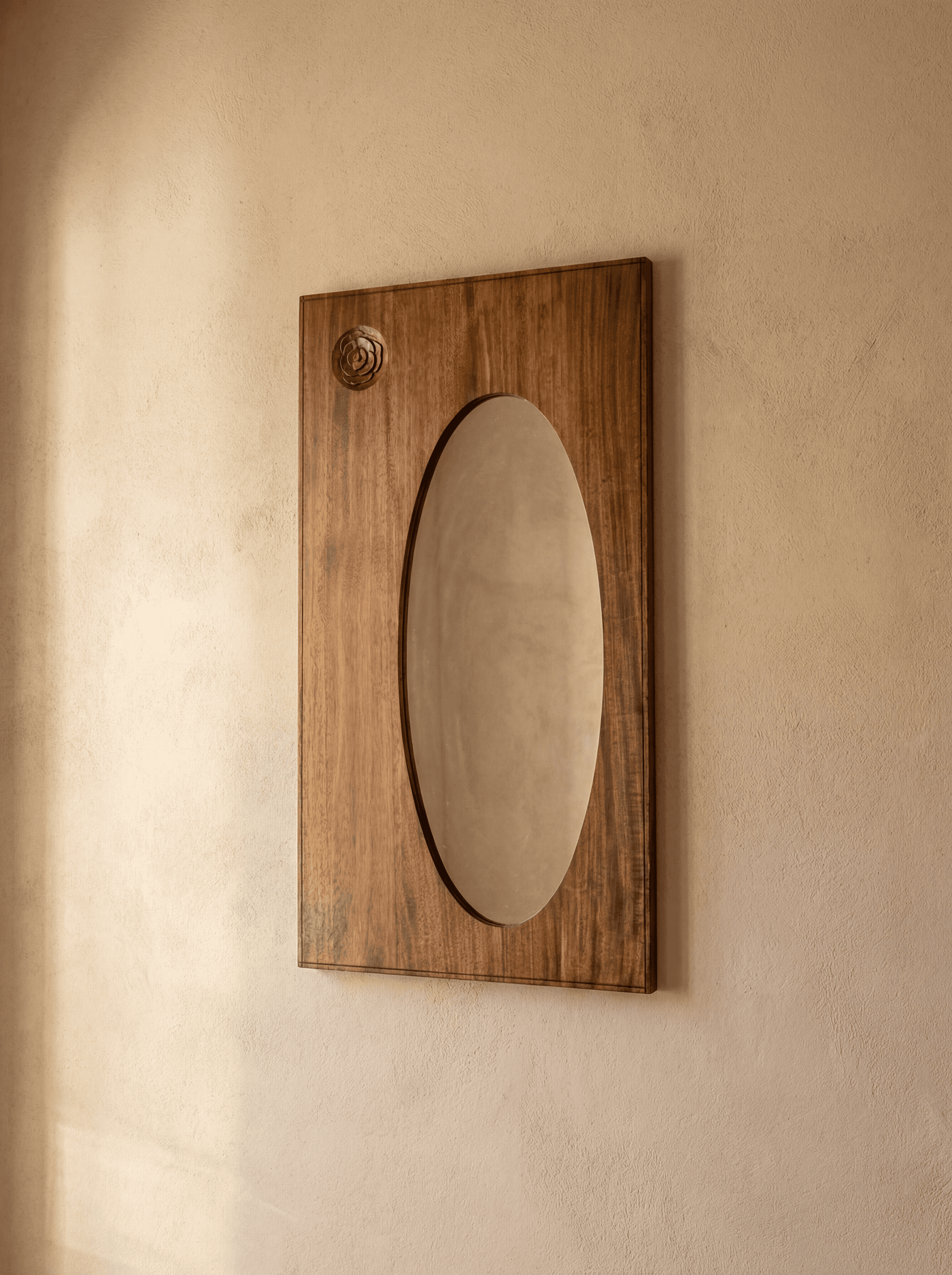 La composition se distingue par un miroir ovale intégré dans un panneau de bois massif, créant un contraste harmonieux entre la douceur de la forme centrale et la sobriété du support rectangulaire. Dans la partie supérieure, une rosace sculptée vient ponctuer la surface du bois et apporte une signature décorative subtile.