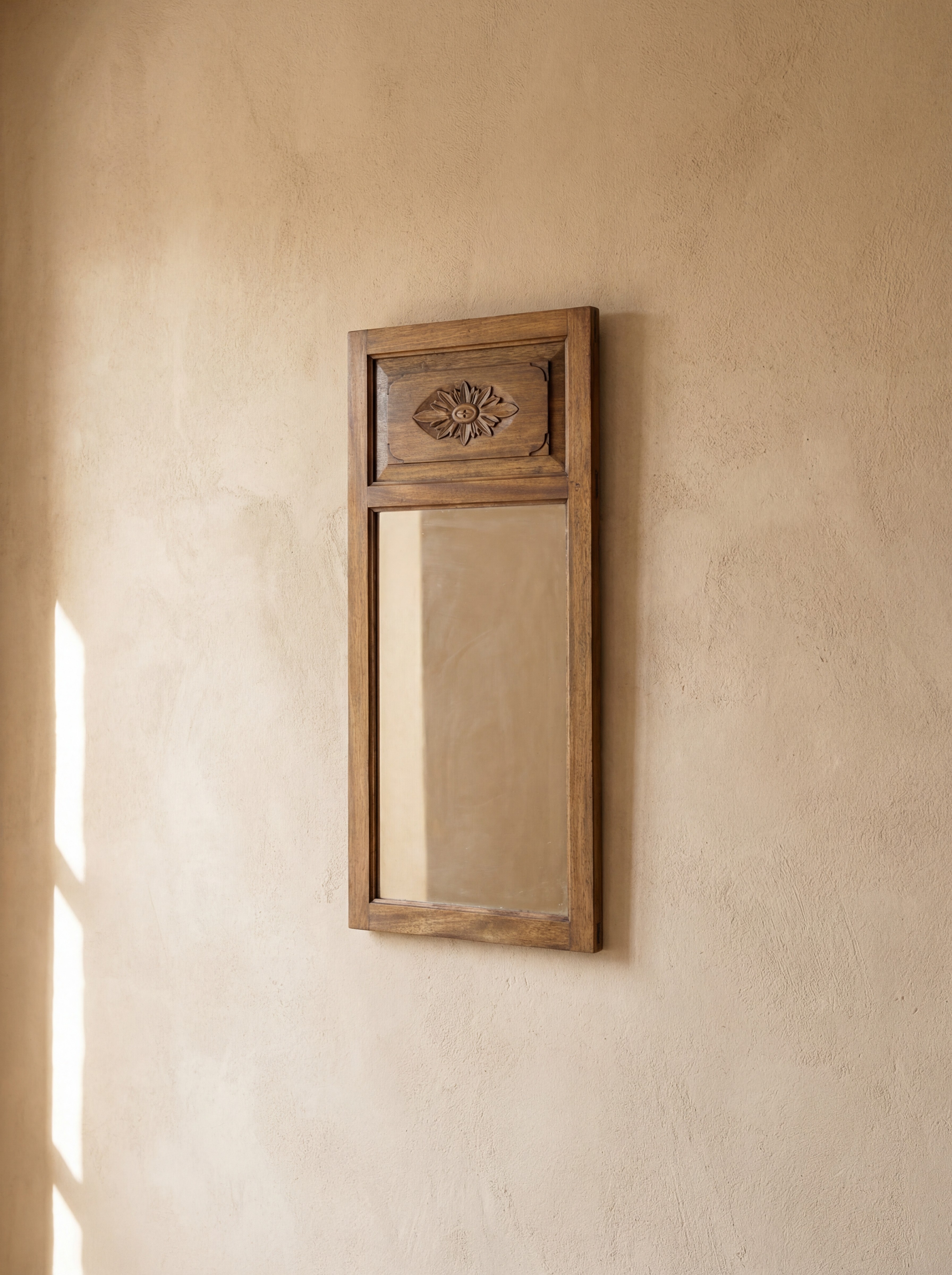 Ce miroir s’inscrit dans la collection « Mémoire gravée dans le bois », où la surface du bois devient un espace d’expression pour le travail de sculpture artisanale. La partie supérieure du cadre est ornée d’une rosace sculptée qui rappelle certains motifs floraux et géométriques présents dans le mobilier traditionnel.