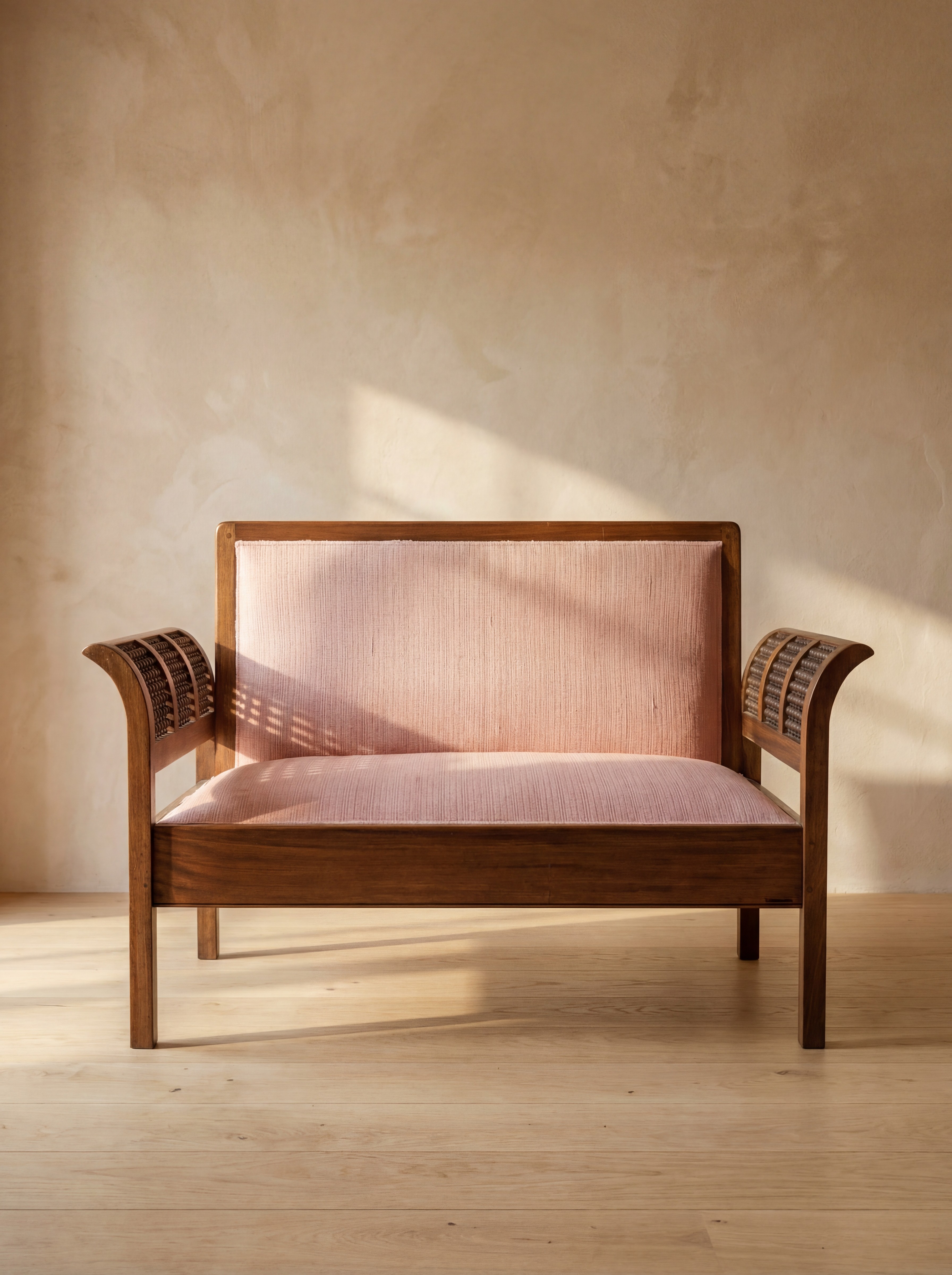 Le contraste entre la structure en bois et le revêtement textile du dossier et de l’assise apporte équilibre et confort à la pièce. L’ensemble propose une lecture contemporaine du divan traditionnel, où le travail artisanal du bois dialogue avec une silhouette sobre et élégante.