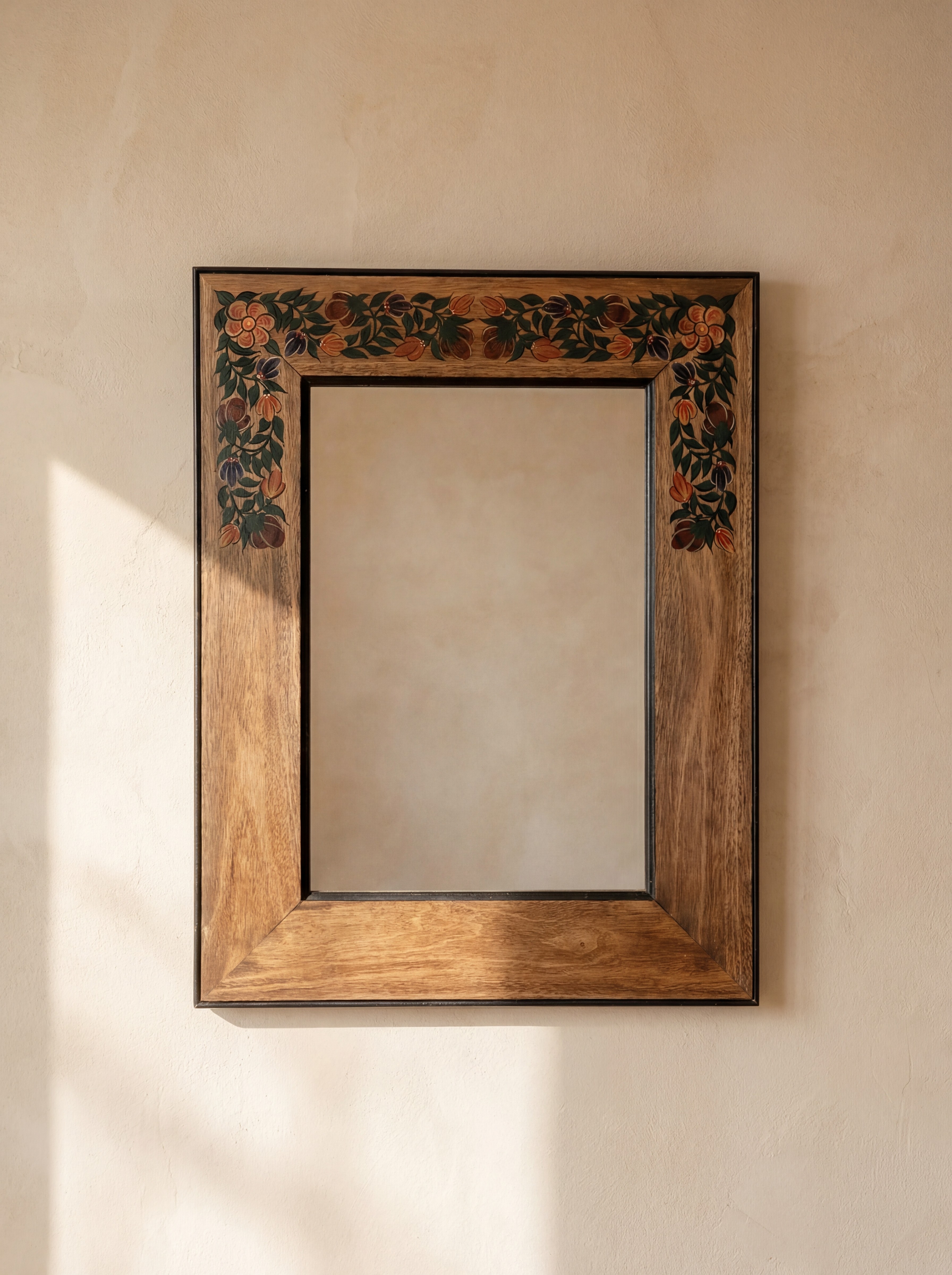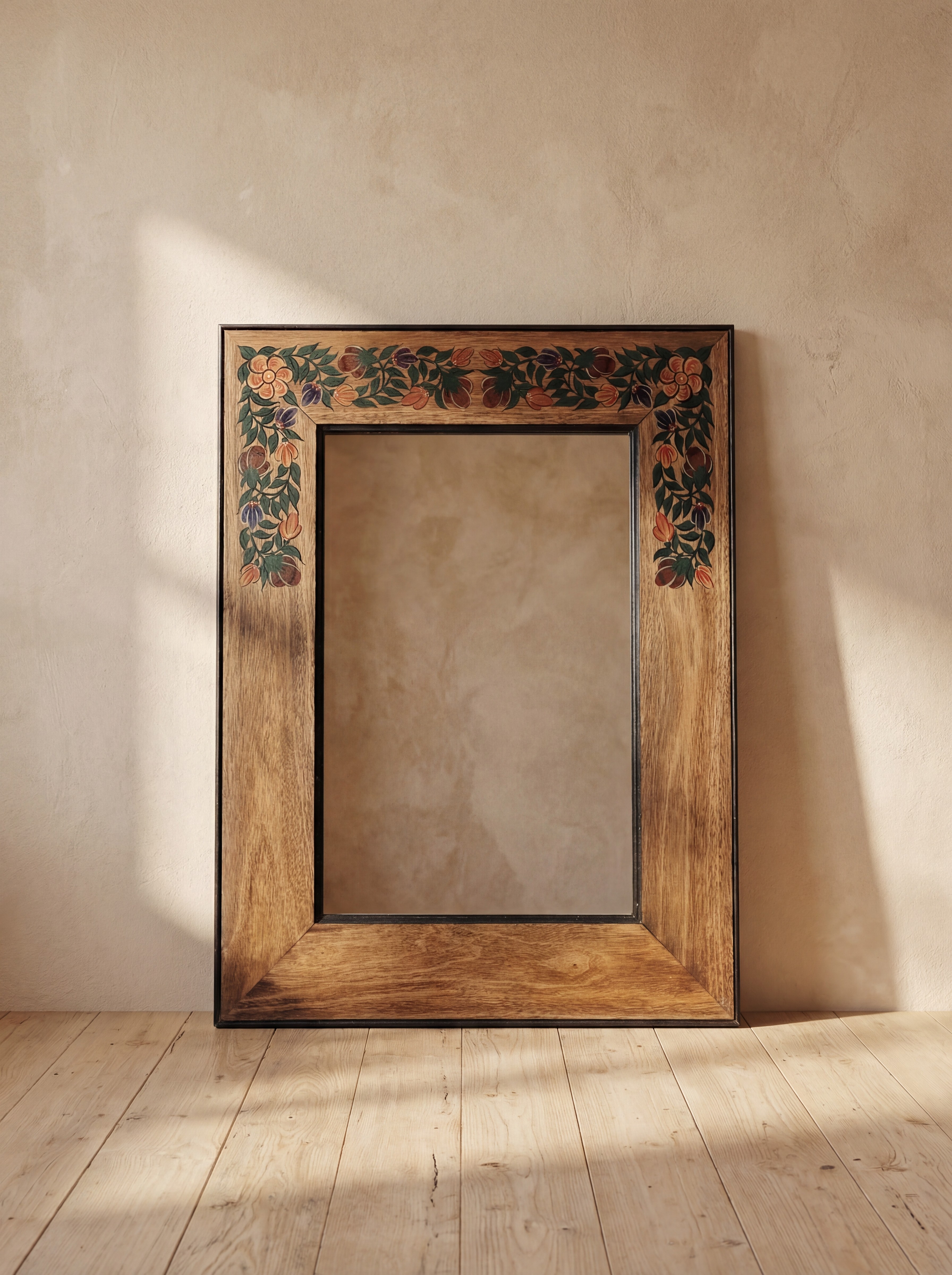Le cadre en bois massif est décoré dans sa partie supérieure par un motif floral peint à la main, composé de feuilles et de fleurs aux couleurs chaleureuses. Ce décor végétal forme une frise délicate qui contraste avec la sobriété du reste du cadre, laissant apparaître la texture naturelle du bois.