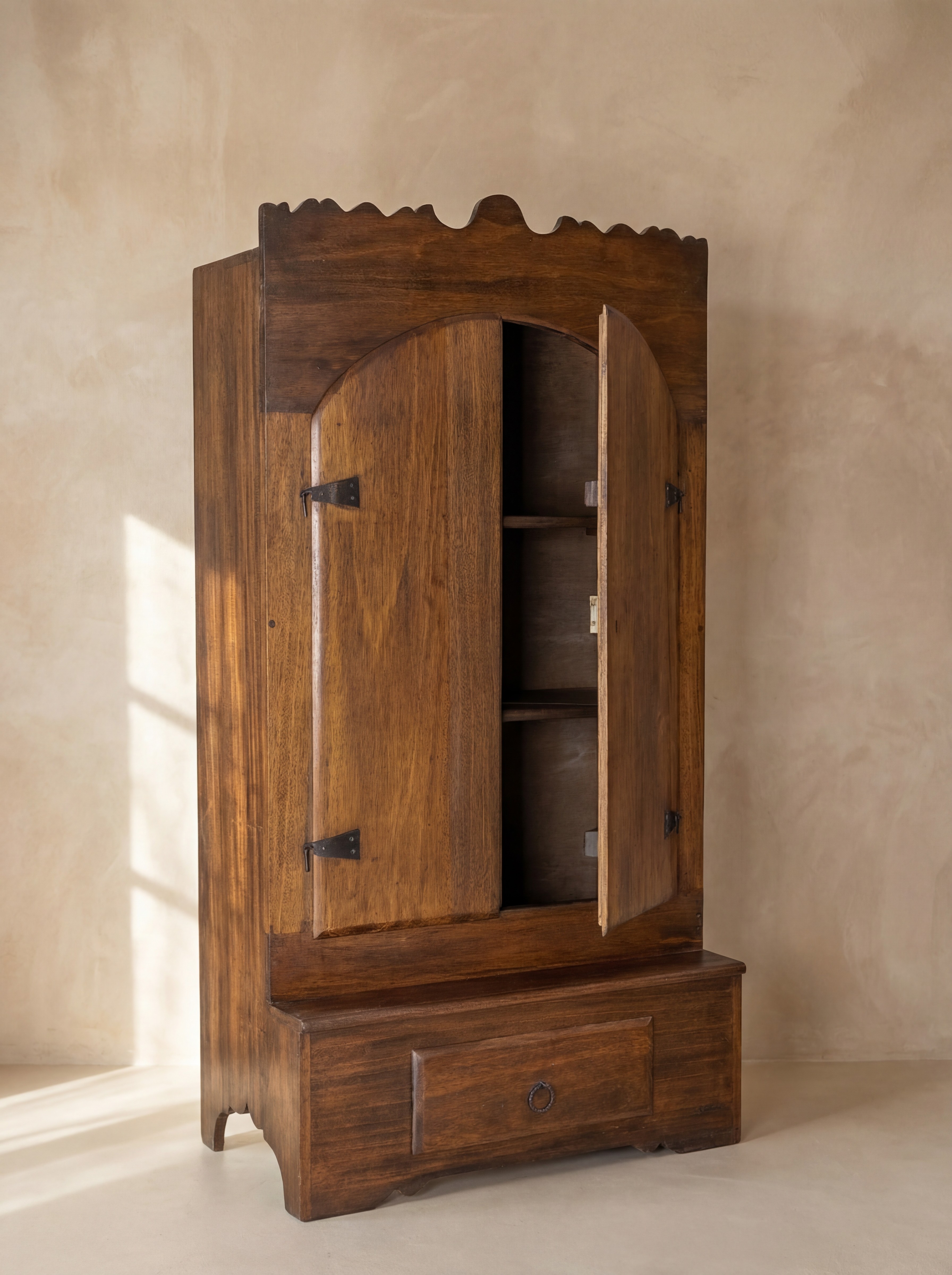 Cette armoire cintrée appartient à la collection « Élégance brute et bois chantourné », qui met en valeur la noblesse du bois massif et la simplicité des formes inspirées du mobilier traditionnel tunisien.