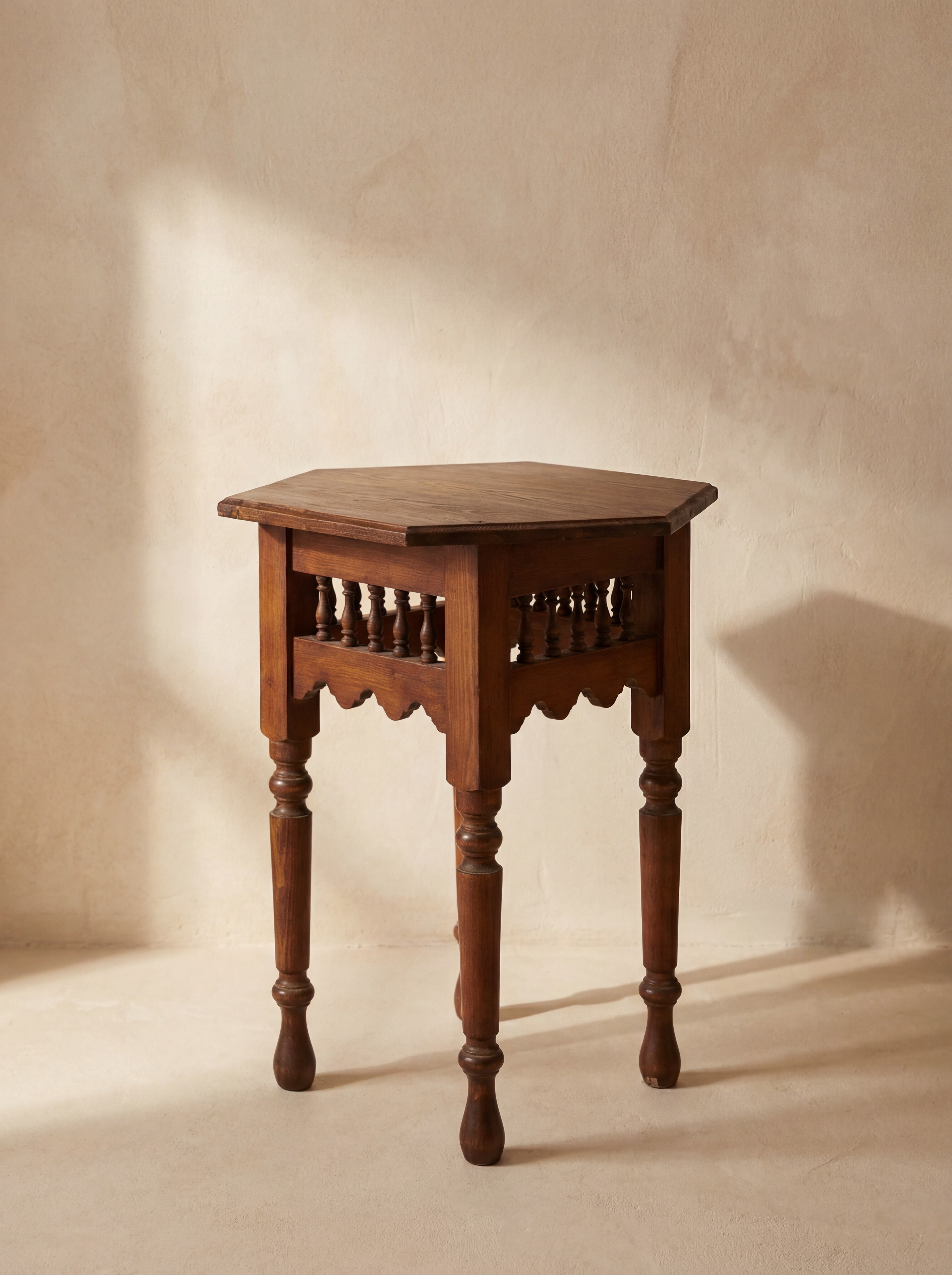 Cette table Karoui – petit modèle appartient à la collection « Élégance brute et bois chantourné », qui met en valeur la simplicité des formes et la richesse naturelle du bois massif. Sa structure légère et équilibrée repose sur quatre pieds tournés, soutenant un plateau polygonal compact inspiré des petites tables traditionnelles tunisiennes.