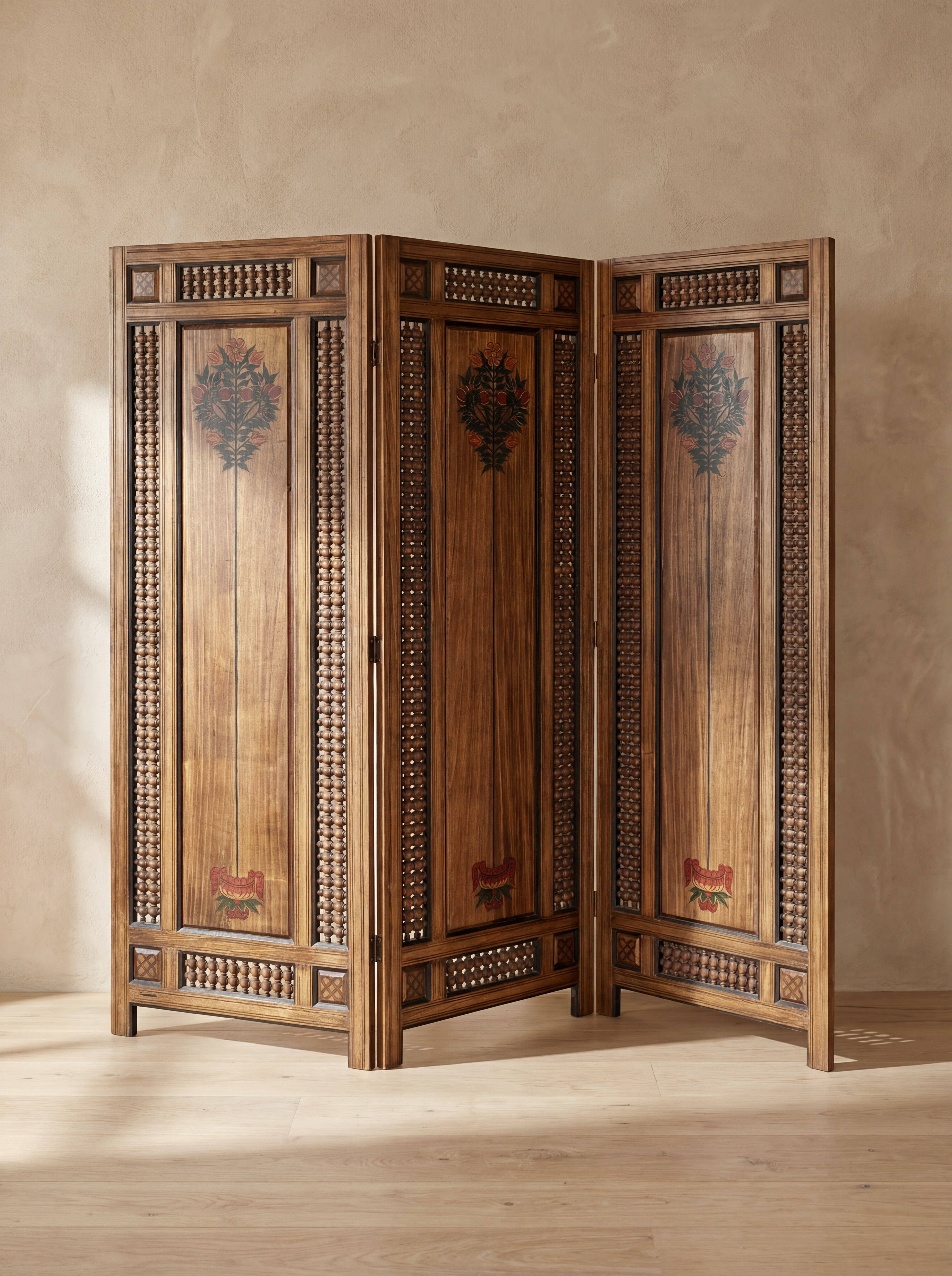 Ce paravent associe deux expressions du savoir-faire artisanal présentes dans les collections « Fleuris de teintes » et « Mémoire gravée dans le bois ». Les panneaux centraux sont ornés de motifs floraux peints à la main, inspirés des meubles décorés traditionnels du patrimoine tunisien, où la composition végétale devient un élément décoratif central.