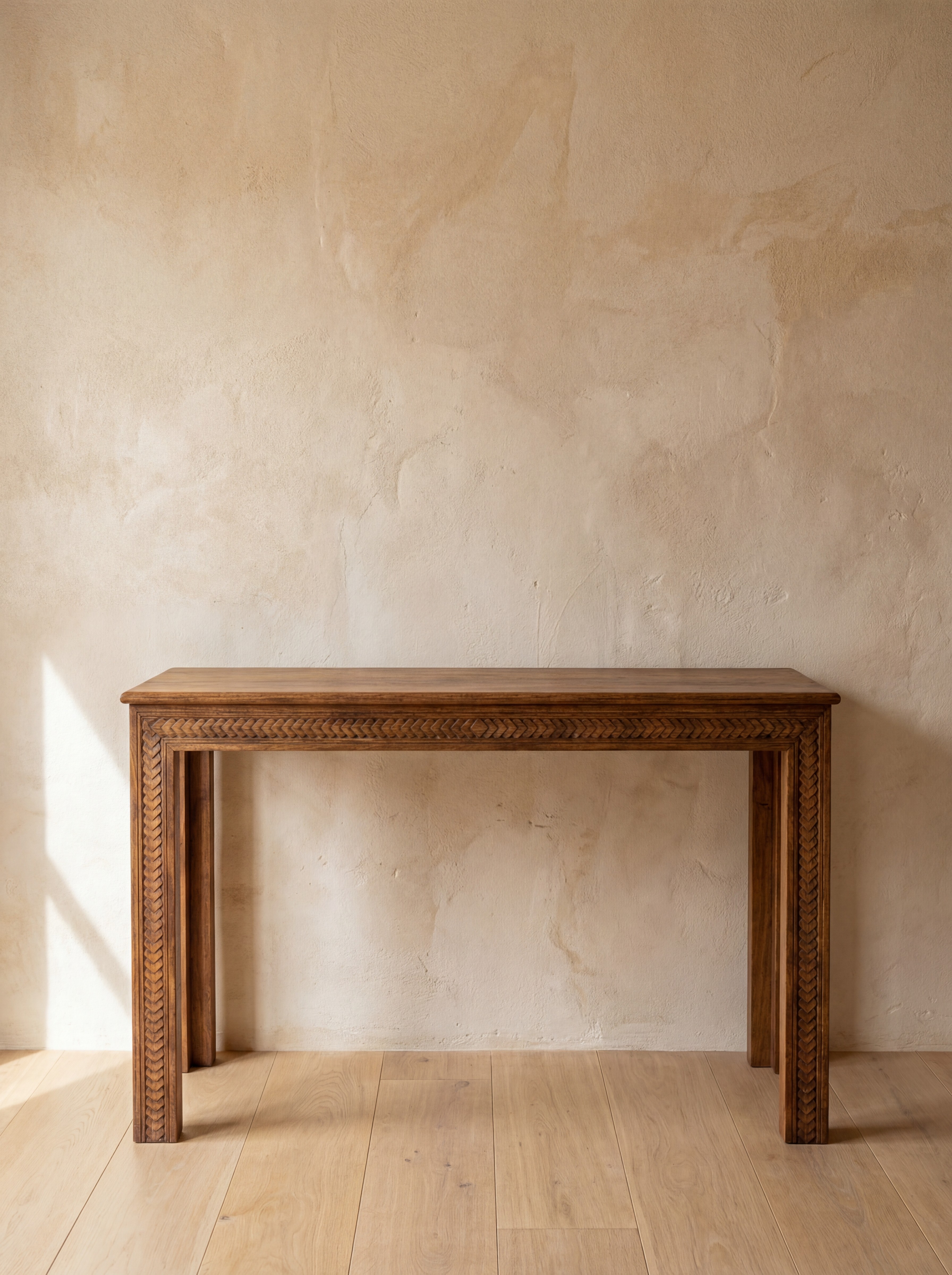 Cette console s’inscrit dans la collection « Mémoire gravée dans le bois », où la surface du bois devient un espace d’expression pour le travail de sculpture artisanale. Le piètement et la ceinture du meuble sont ornés de motifs gravés qui forment une frise décorative continue, inspirée de certains détails présents dans le mobilier traditionnel.