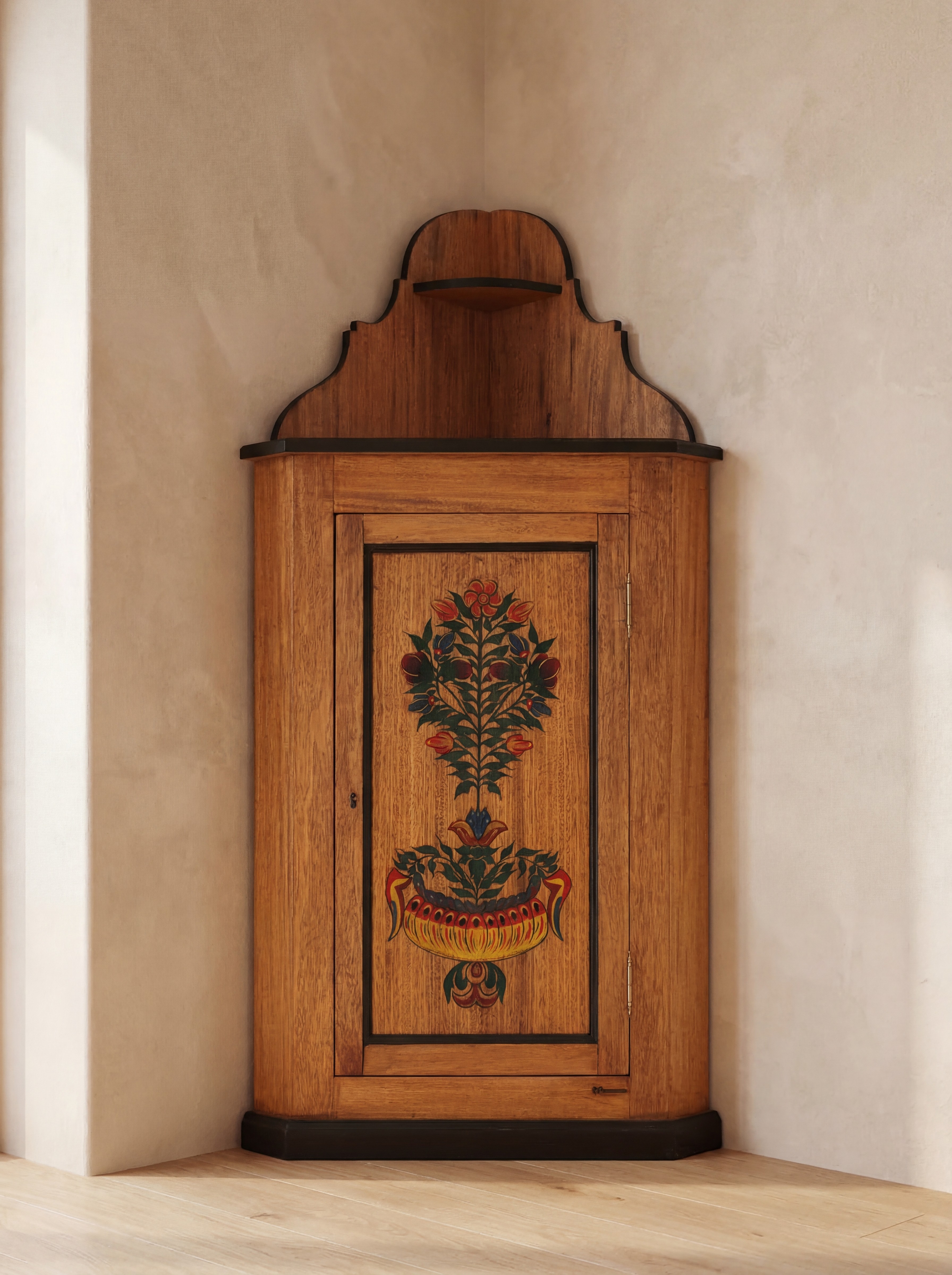 Ce meuble de coin fleuri peint associe la chaleur du bois à la richesse d’un décor peint inspiré des motifs traditionnels.