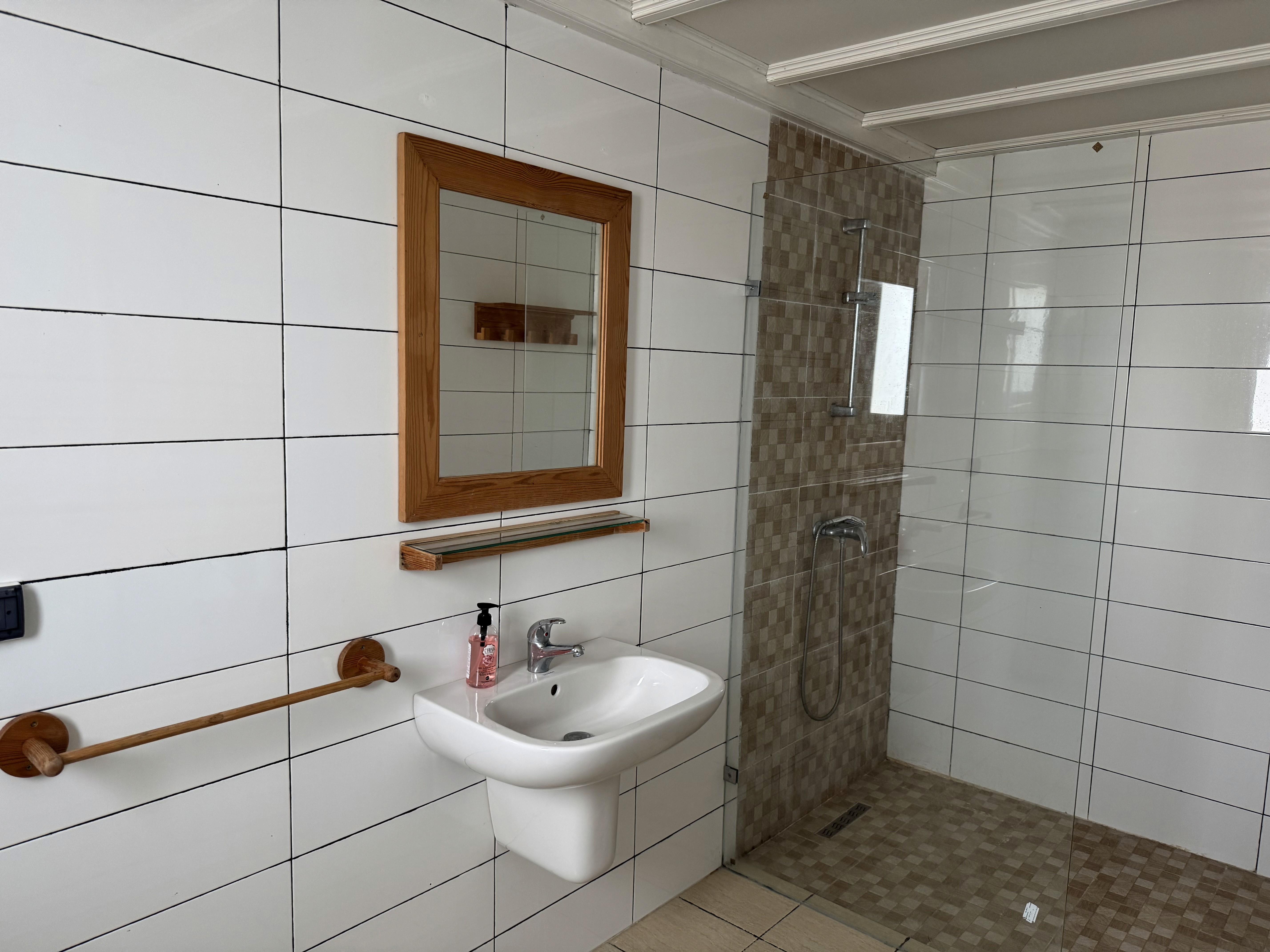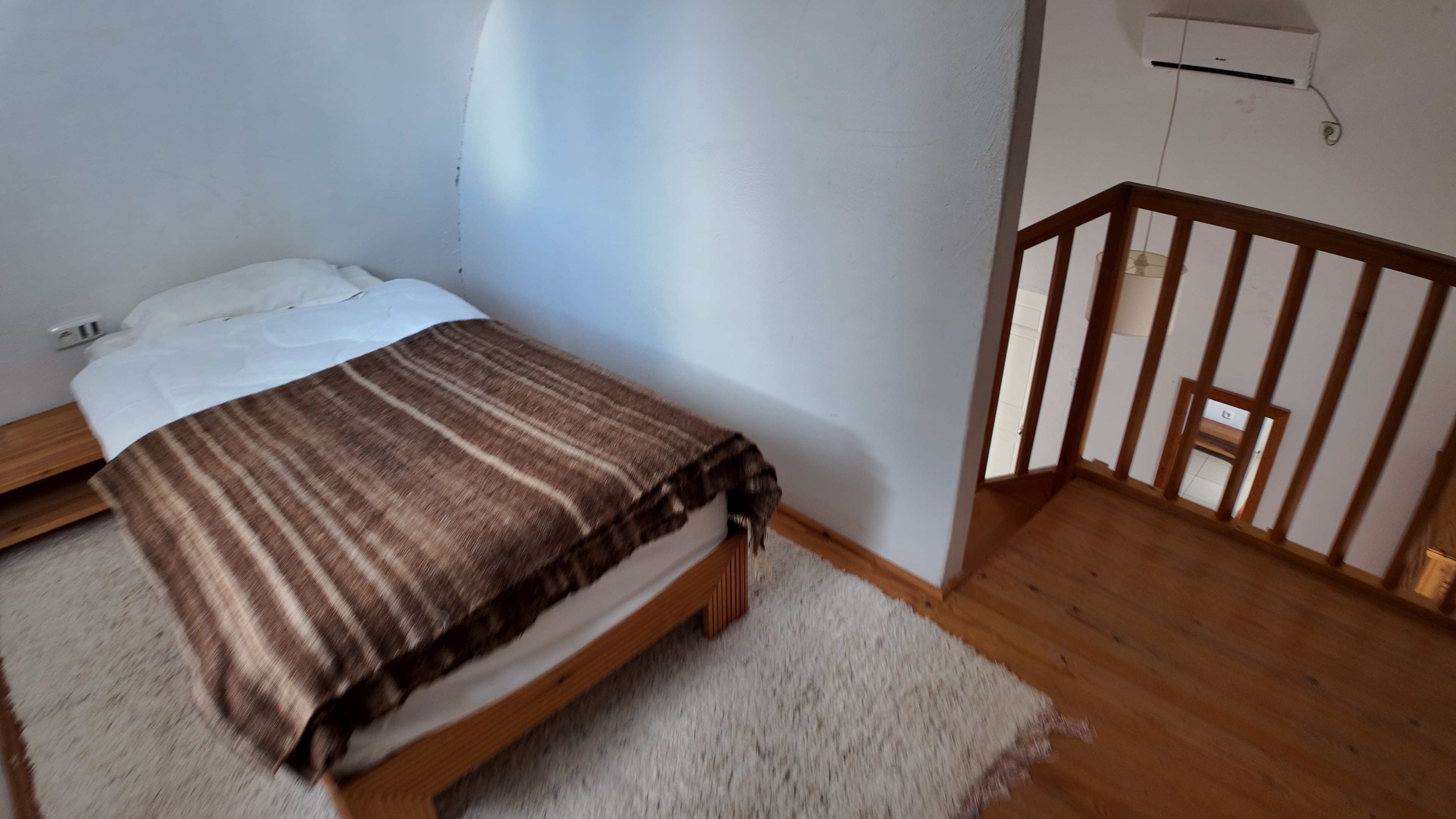 Au niveau principal, la suite dispose d’un lit double et de deux lits simples, permettant d’accueillir familles ou petits groupes. Un escalier en bois mène à une mezzanine où se trouve un lit simple supplémentaire.